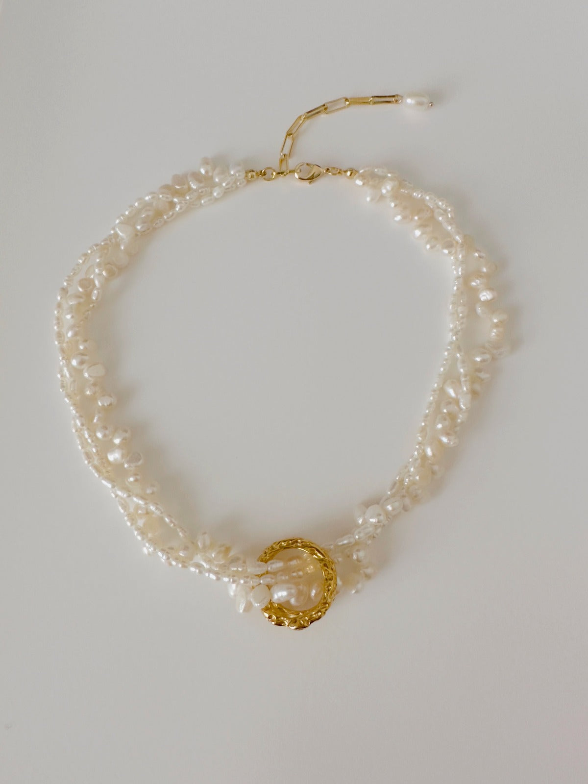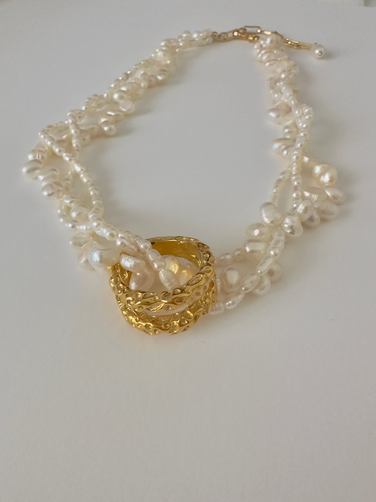 The Evelyn necklace is a unique vintage-style necklace of three pearl necklaces twisted together. Each pearl necklace has a different shape and size, making this design one of a kind. The pearls give it a lot of personality and are sure to add that vintage look to any outfit!