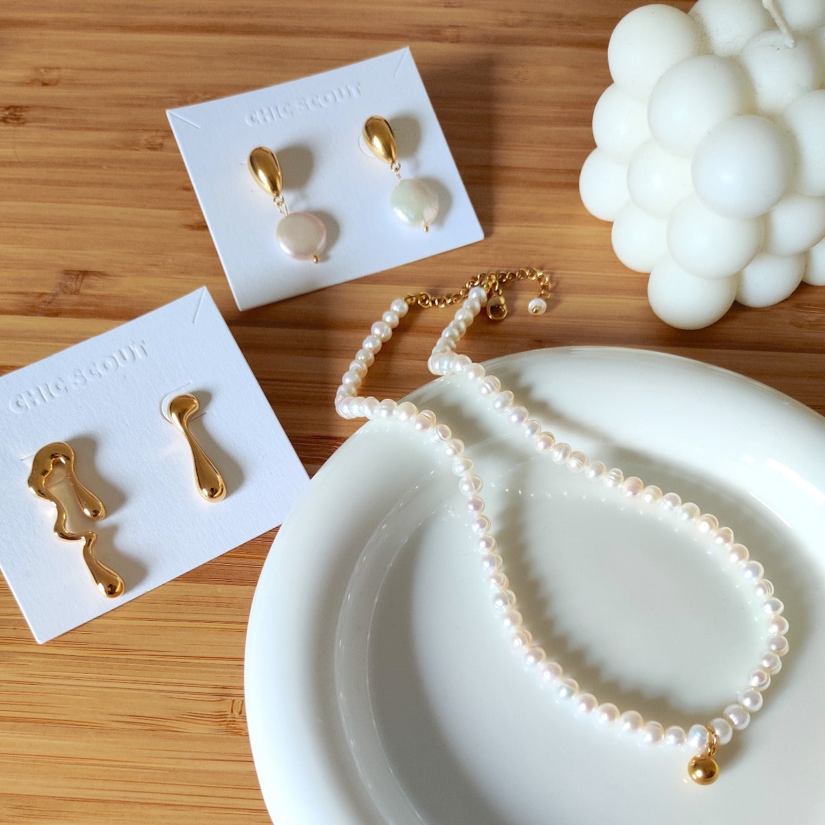 Materials: Real organically-shaped freshwater pearls. Stainless steel, 18k gold plating.