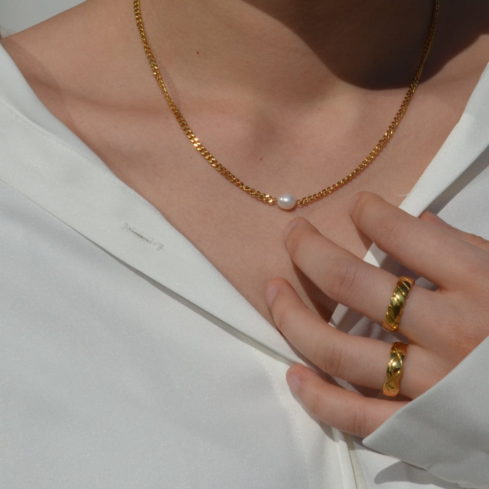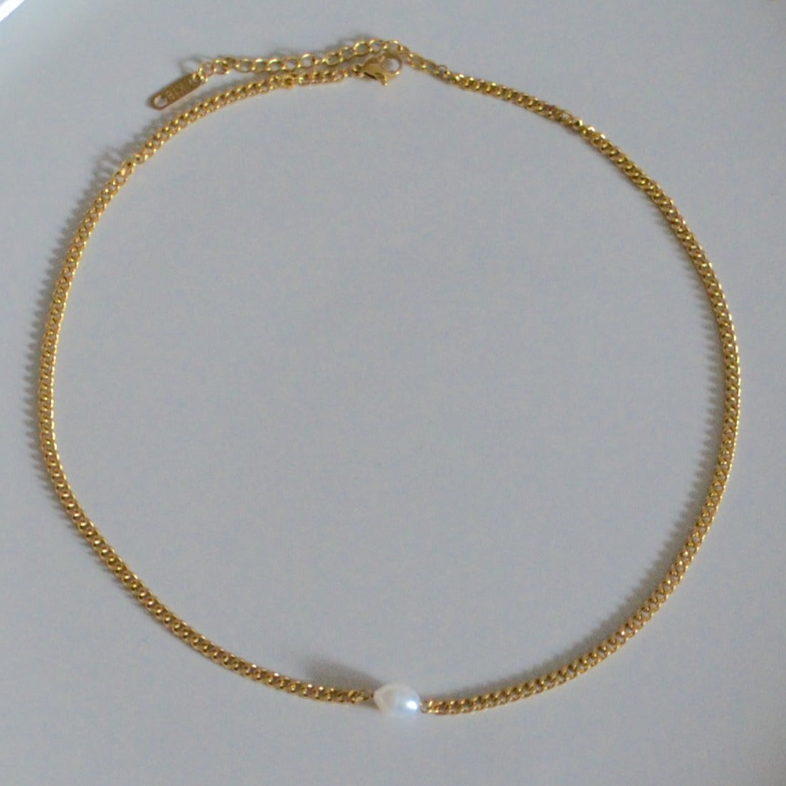 Curb chain necklace with a small pearl in the middle. This is a very elegant necklace in the necklaces collection. Perfect for one-piece dress looking. Small accessories always make the whole outfit so different. Each pearl is slightly different